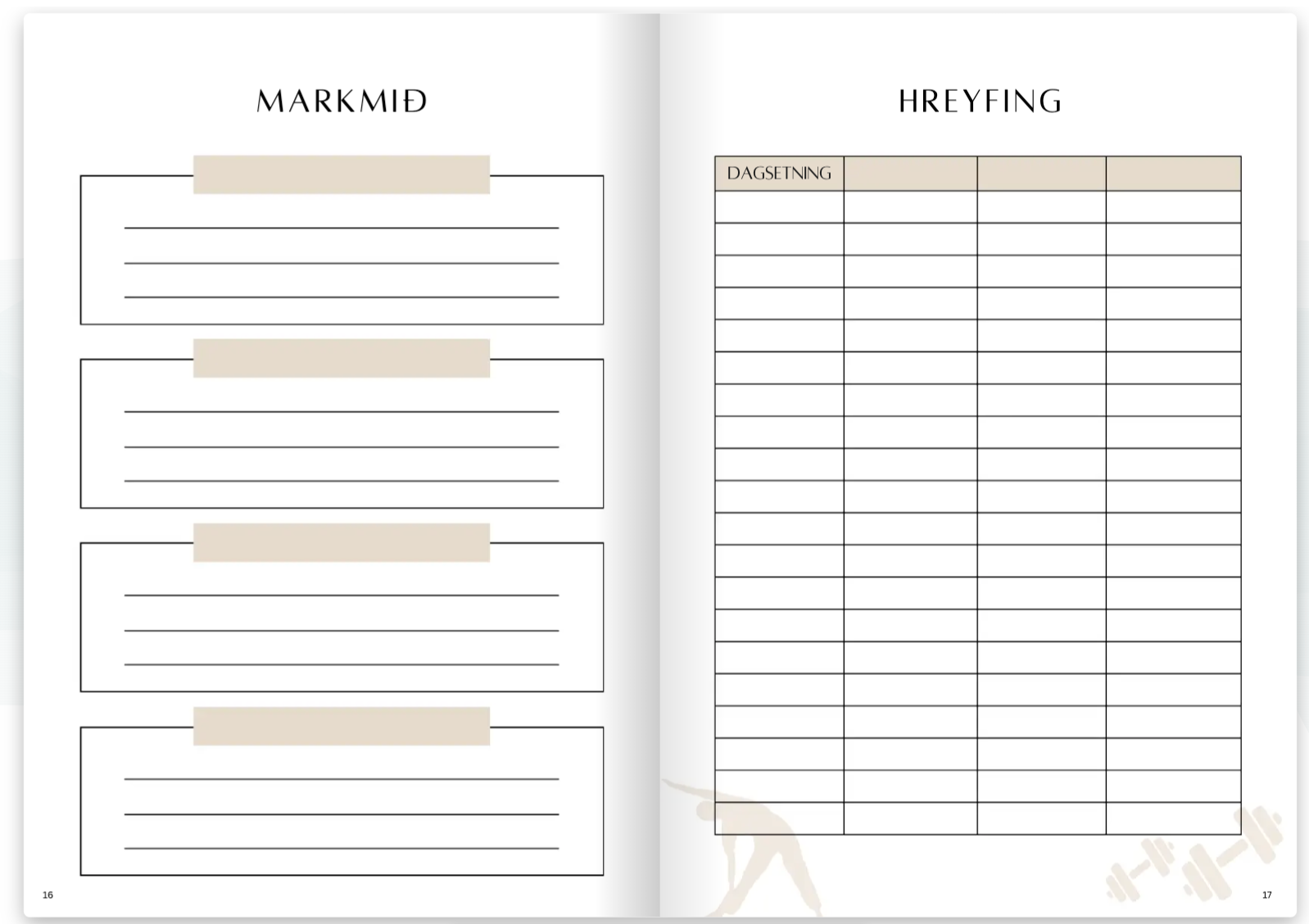 - Í byrjun hvers mánaðar getur þú fyllt inn markmið mánaðarins, hreyfingu og venjur.