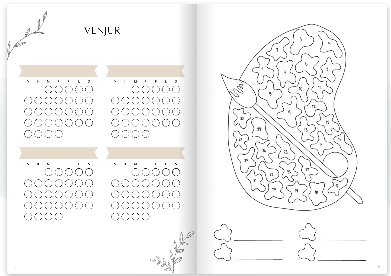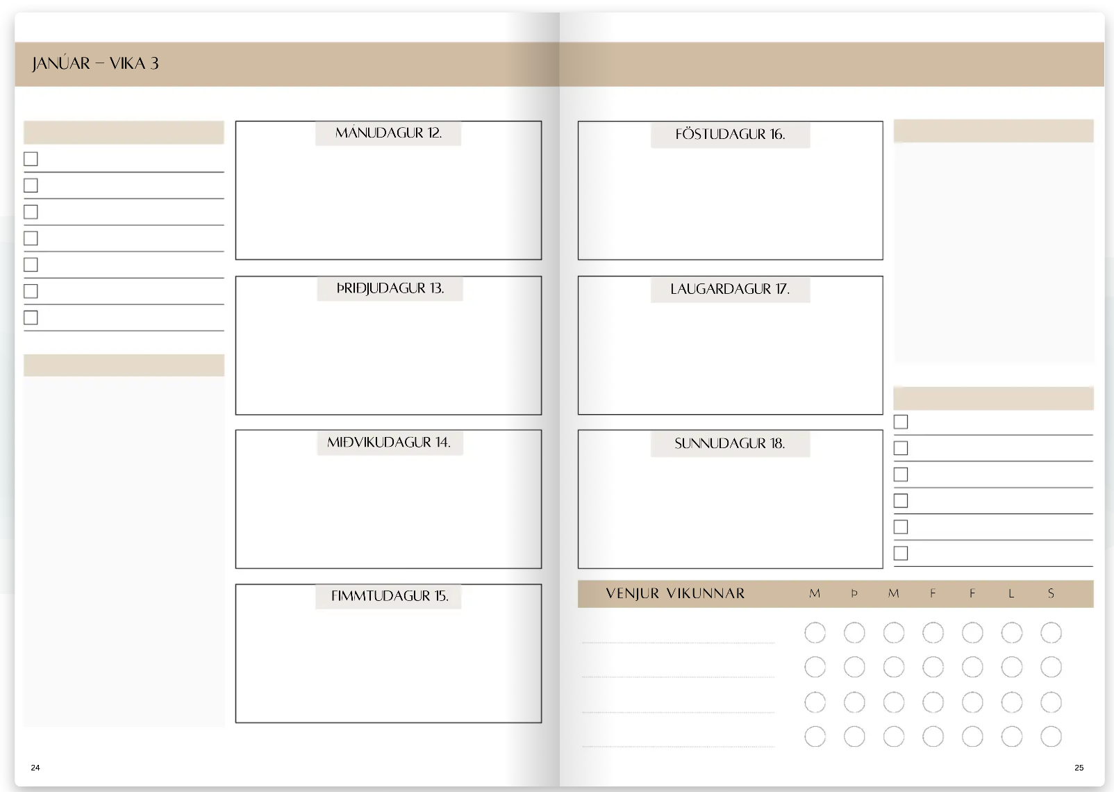 - Í hverri viku opnu eru dálkar fyrir hvern dag, tjékk-listar, venjur vikunnar og fleira.